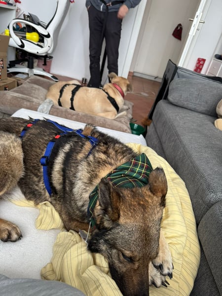 Im Park hat Hosé zum ersten Mal Eichhörnchen entdeckt. Diese kleinen Geschöpfe hat er noch nie zuvor gesehen und fand sie äußerst interessant. Natürlich wollte er zu ihnen, und ich glaube, wenn es nötig gewesen wäre, hätte er sie sogar vom Baum geschüttelt! Auch große Raben und Wildhasen auf dem Feld haben sein Interesse geweckt. Dieses Verhalten zeigt, dass er trotz seines Alters einen ausgeprägten Jagdtrieb hat. Daher sollten in seinem neuen Zuhause keine kleinen Tiere oder Vögel leben.