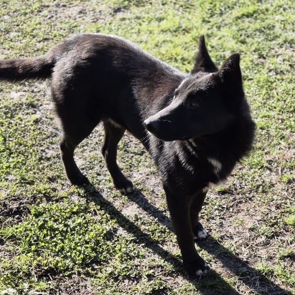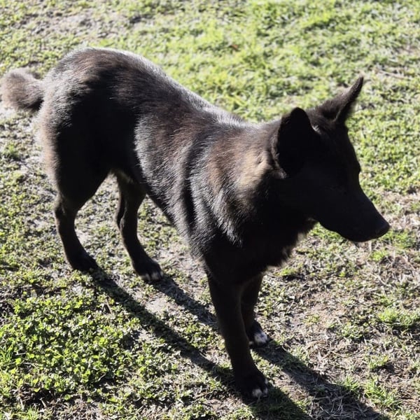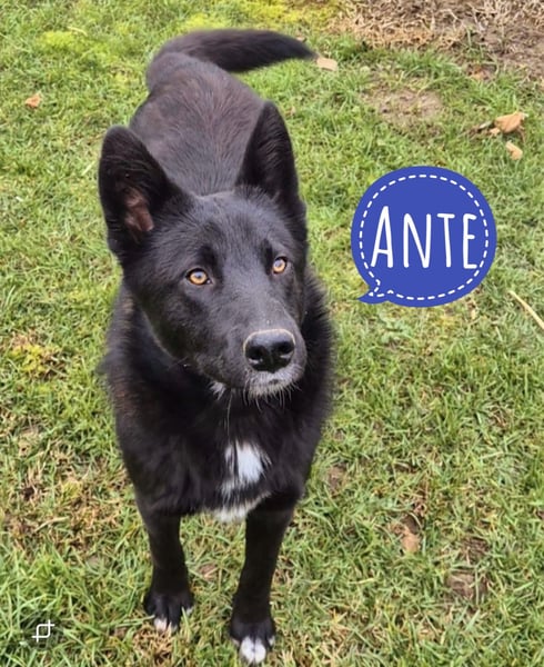 Ante ist ein Bub, er ist ca. 1 Jahr alt (geb. 15.11.2023), ca. 60cm groß und wiegt ca. 20-25kg, vermutet wird ein schwarzer Schäferhund Mix.