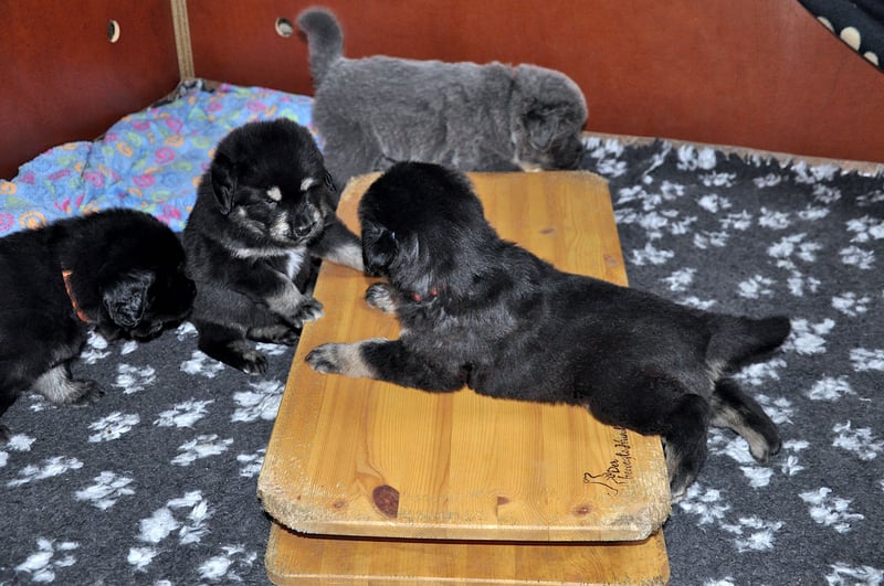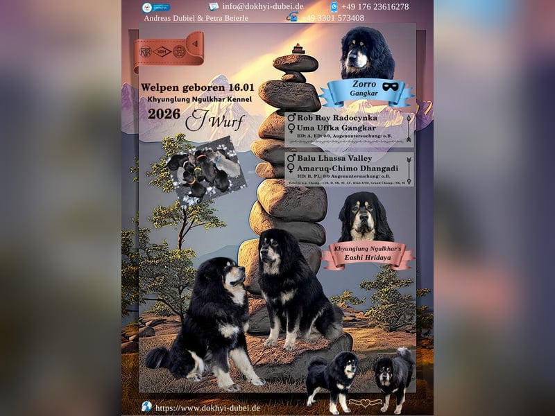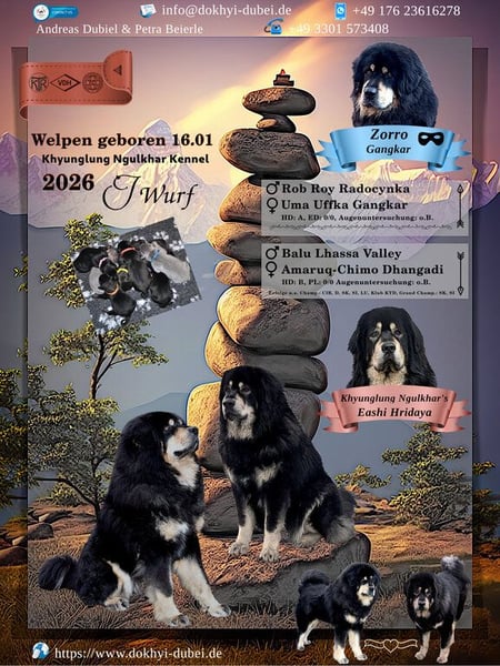 An alle jetzigen und zukünftigen Freunde der Khyunglung Familie. Im Januar 2026 erwarten wir Welpen von unserer Hridaya. Gestern Nacht rollte der Welpenexpress. Hallo, da sind wir nun. Inzwischen trocken, satt und zufrieden. Nun haben sich alle von den Strapazen der Nacht erholt, die erste Nacht mit Mutti gekuschelt und Durst, immer dieser Durst..... Wenn Ihr wissen wollt, wie unsere Reise weitergeht schaut öfter mal rein. Der Vater dieses Wurfes ist der sehr attraktiver und charmanter Rüde Zorro Gangkar. Er lebt bei unseren Freunden in der Slowakei. Dies wird der letzte Wurf unserer stolzen Schönheit Hridaya sein. Wer mehr über uns und unsere Hunde wissen möchte ist herzlich eingeladen uns auf unserer Homepage zu besuchen. Bilder sagen mehr als Wort. Welche Voraussetzungen Sie als neuer Do Khyi Besitzer mitbringen müssen klären wir gerne gemeinsam in einem persönlichen Gespräch. Wir freuen uns über jeden seriösen Kontakt. Also bis dann, auf ein baldiges Kennenlernen. http://www.dokhyi-dubei.de/home/