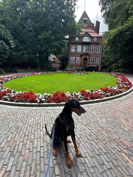 Sein Vater ist mehrfacher Gewinner großer Dobermann-Championships und überzeugt durch Exterieur, Nervenstärke und Arbeitsbereitschaft.