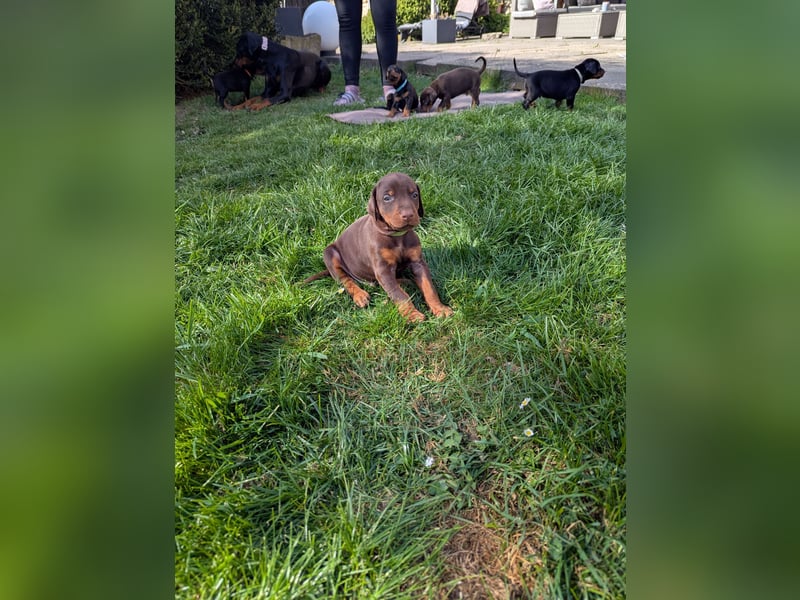 Dobermann Welpen sind wachsam, intelligent und äußerst loyal. Diese energiegeladene Rasse ist bekannt für ihre Schutzinstinkte und ihre enge Bindung zu ihrer Familie. Sie benötigen frühzeitige Sozialisierung und konsequentes Training, um ihr volles Potenzial als treue und gehorsame Begleiter zu entfalten.