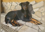 Nuts ist vermutlich eine Dobermann Mix Hündin. Das Alter können wir nur schätzen.