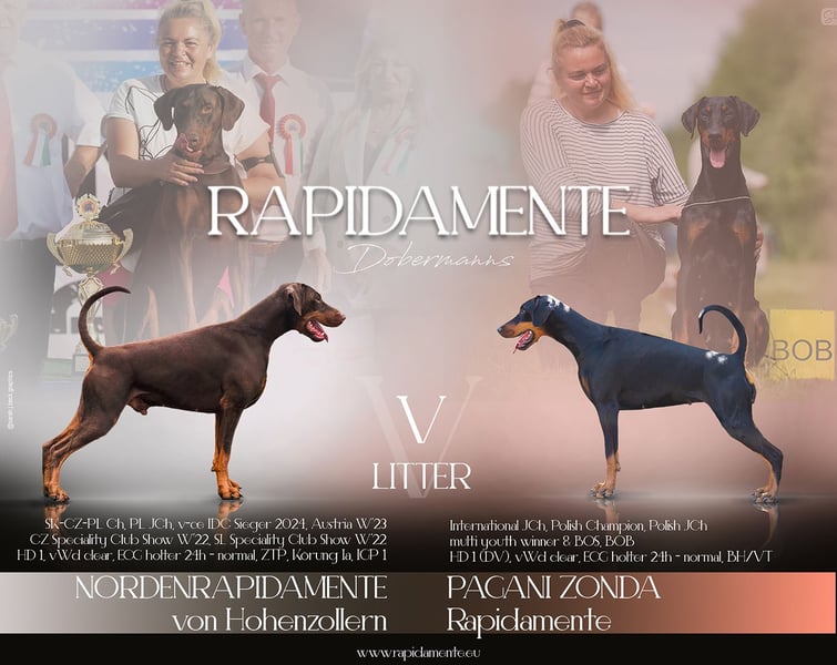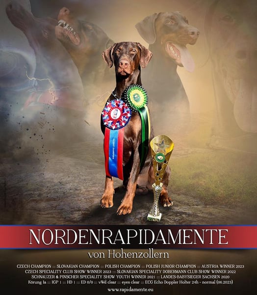 SK Ch, CZ Ch, PL Ch, PL JCh, v-ce IDC Sieger 2024, Austria W'23, Czech Speciality Club Show W'22, Slovakian Speciality Dobermann Club Show W'22, Schnauzer & Pinscher Speciality Show JW'21, Landes-Babysieger Sachsen 2020