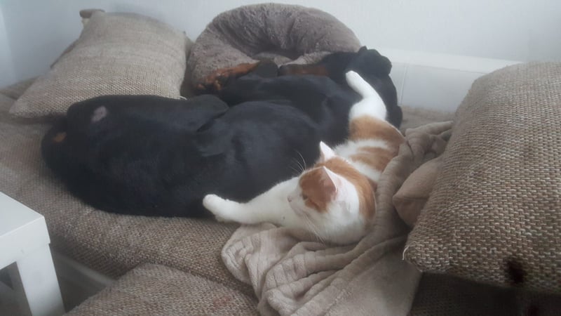 Er hat die letzten 4 Jahre in einem Messiehaushalt gelebt und war entsprechend krank, befallen von jeglichem Mist und zu dünn.