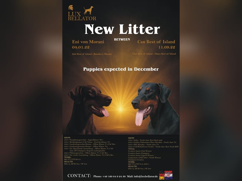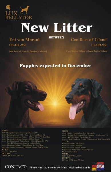 Aus der vielversprechenden Verbinung von Eni von Morani mit Can Best of Island haben wir aus unserem Wurf Welpen abzugeben. Für nähere Informationen besuchen Sie www.luxbellator.de oder Instagramm: "dobermanneni".