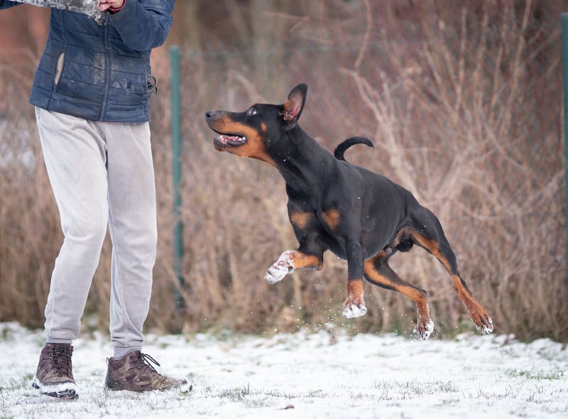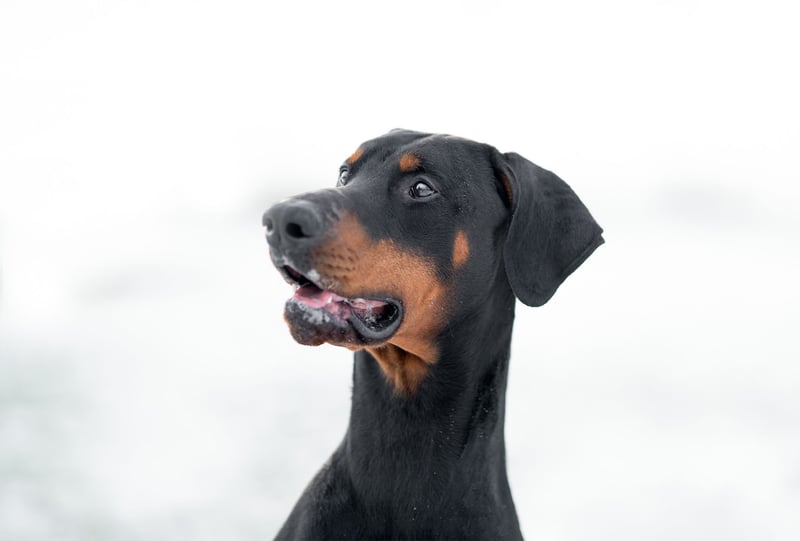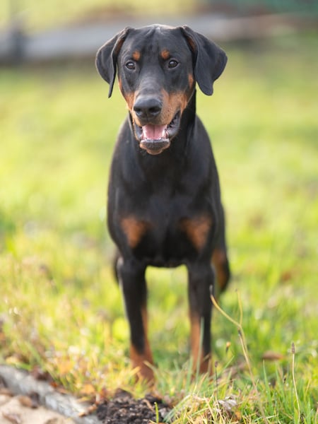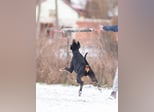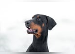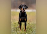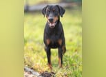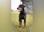 Ein junger schwarzer Dobermannrüde ist auf der Suche nach einem neuen Wirkungskreis.