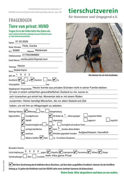 Sein neuer Lieblingsmensch sollte unbedingt Hundeerfahrung haben und wissen, was Arbeitsrassen sind. Dobermänner wurden ursprünglich als Wach und Schutzhunde gezüchtet und sind dementsprechend jeder Zeit bereit aktiv zu sein. Umso mehr benötigen sie oft Anleitung dabei, selbstständig zur Ruhe zu kommen und auch draußen zu „chillen“ und einfach mal nichts zu machen.