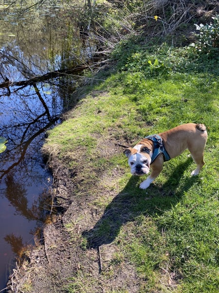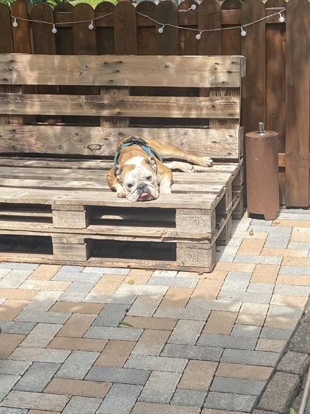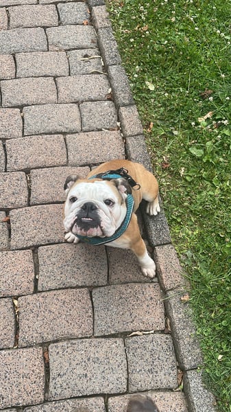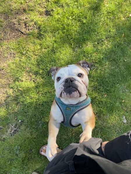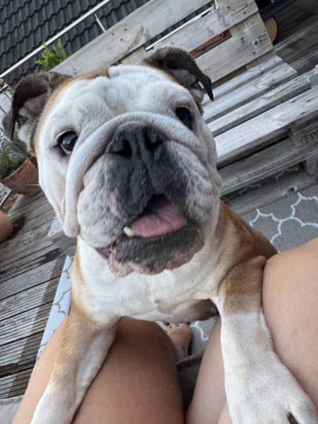 Gesundheitlich ist unsere Bulldoggen-Dame ein echtes Goldstück. Sie ist gerne draußen unterwegs und genießt entspannte Gassirunden, braucht aber keine langen oder sportlichen Strecken. Toben und wildes Herumrennen sind nicht so ihr Ding – sie liebt es eher gemütlich und verbringt ihre Zeit am liebsten entspannt auf der faulen Haut, gern in der Nähe ihrer Menschen. Beim Tierarzt waren wir mit ihr bislang ausschließlich zu Impfungen und den regelmäßigen Kontrollen; sie war noch nie krank und ist insgesamt eine ruhige, ausgeglichene Hündin.