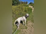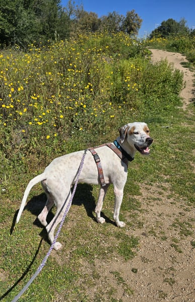 Rico ist ein hübscher, ja fast schon eleganter Rüde. Er hat eine sportliche, grazile Figur, sein Fell schimmert weiß mit beigen Flecken.