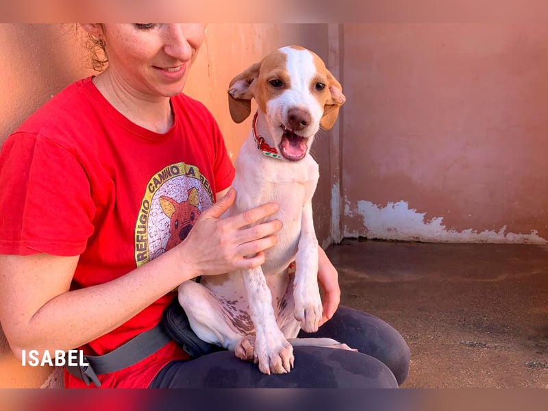 Paz ist eine Podenca und ihre Welpen sehen stark danach aus, als hätte ein Pointer mitgemischt. Das Ergebnis ist ein fröhlicher, sportlicher und ziemlich neugieriger Mix mit Jagdambitionen. Die ganze Truppe ist welpentypisch verspielt, quirlig und für jeden Blödsinn zu haben. Menschen finden sie super, Regeln kennen sie bisher, wenn überhaupt, nur vom Hörensagen. Sie wissen noch nicht, wie das Leben außerhalb des Tierheims in einem Haushalt so funktioniert und müssen natürlich alles noch von Grund auf lernen.