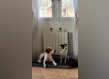 Levi ist es gewohnt, mit Geschirr und Halsband zu laufen. Drinnen ist er ruhig und lieb. Draußen interessiert er sich für Vögel.