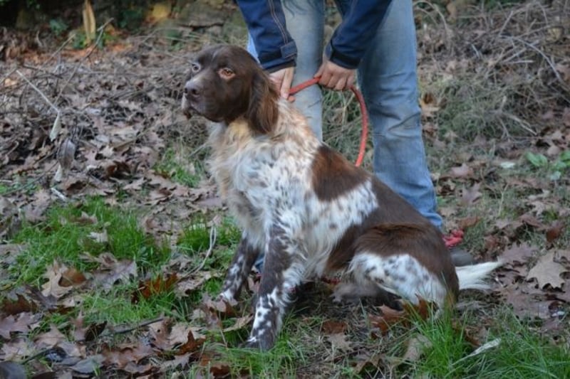 Als English-Setter-Mischling bringt Mottle typisches Jagdhundeverhalten mit in sein neues Zuhause. Wahrscheinlich hat er einem Jäger als Arbeitshund gedient und durfte seinen Käfig nur verlassen, wenn es zur Jagd ging.