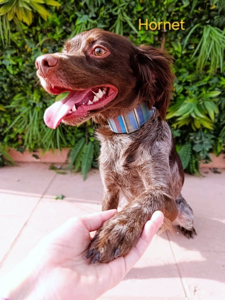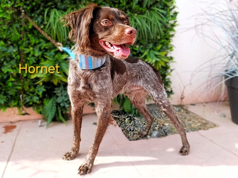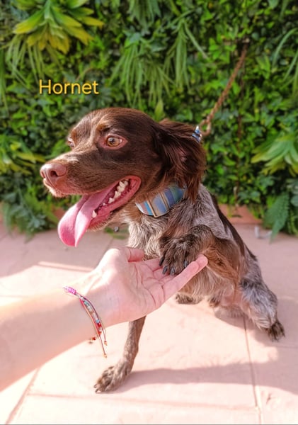 Hornet ist ein ausgesprochen freundlicher und sozialer Hund. Er hat keinerlei Ängste und geht von Anfang an offen auf alle Menschen zu, immer fröhlich und auf der Suche nach Streicheleinheiten. Er liebt Körperkontakt – wenn er dich sieht, kommt er freudig angelaufen, stellt sich an deine Beine und schaut dich an, bis du ihn streichelst. Danach bleibt er ganz ruhig stehen oder legt sich sogar hin, damit du ihm den Bauch kraulen kannst. Mit anderen Hunden ist er ebenfalls sehr gut, sozial, unterwürfig und nicht dominant. Er ist verspielt und schnüffelt gern viel im Park, verhält sich aber auch alleine sehr gut. Wenn er mit dem Erkunden fertig ist, legt er sich lange ruhig in den Schatten – ohne sich zu bewegen, ohne aufzustehen und ohne zu bellen, selbst wenn andere Hunde vorbei laufen oder es Unruhe gibt. Er ist wirklich ausgeglichen und sehr angenehm im Umgang. Ein unkomplizierter Hund, gut für Anfänger geeignet und perfekt für Familien, die einen freundlichen Begleiter suchen, der gerne spazieren geht und viele Streicheleinheiten genießt. Vorgeschichte: Hornet wurde ausgesetzt in Almodóvar gefunden. Er streunte mehrere Tage in der Umgebung des Dorfes herum, auf der Suche nach Futter und Unterschlupf.