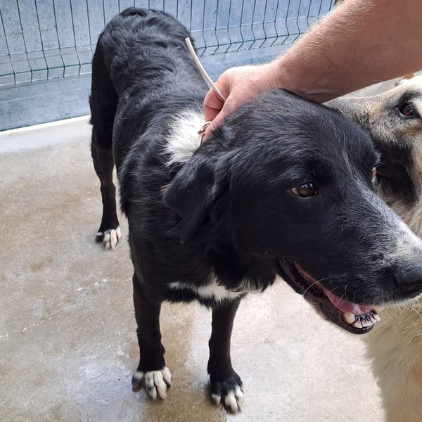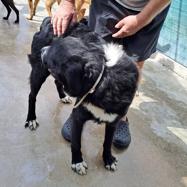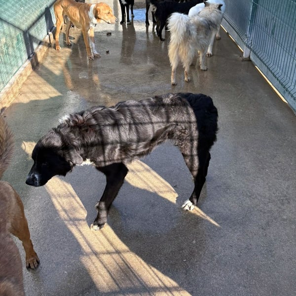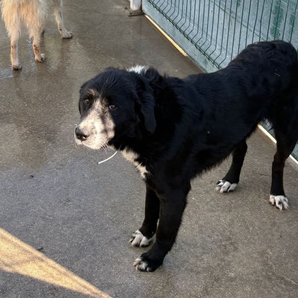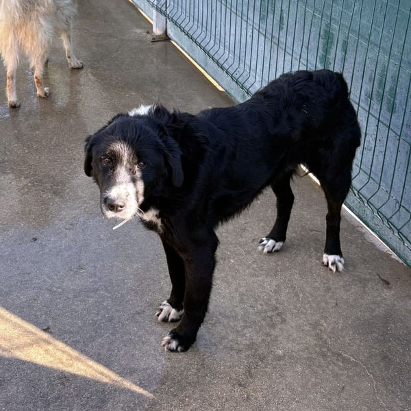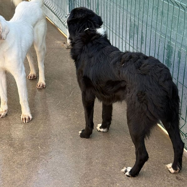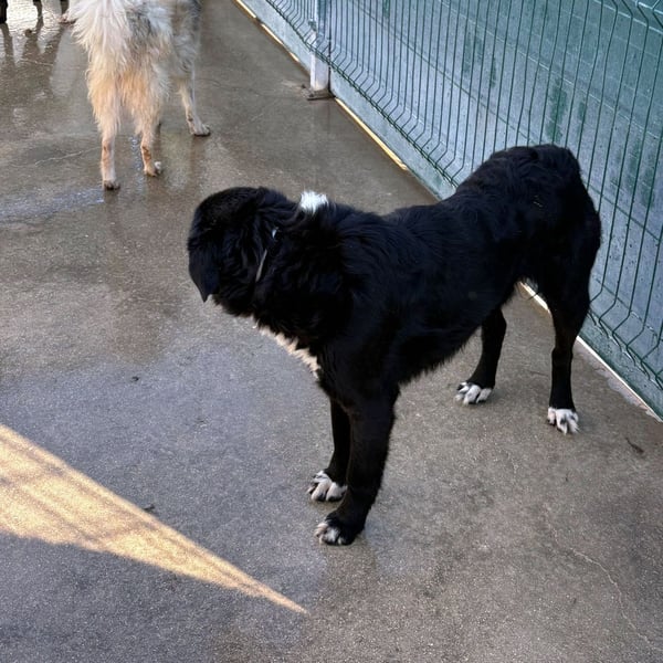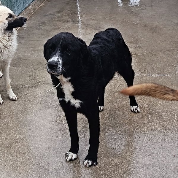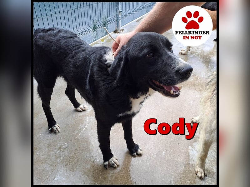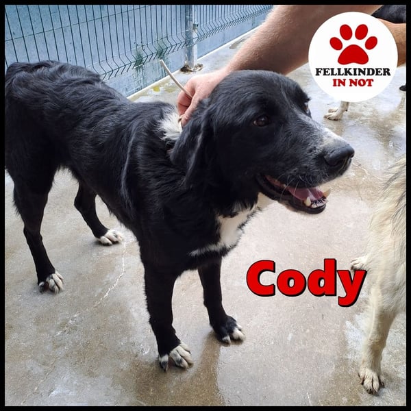 Cody ist ein ruhiger Rüde und möchte im Zwinger keinen Ärger, er ist menschenbezogen und freut sich sehr über Streicheleinheiten, wenn jemand in den Zwinger kommt. Mit den vier weißen Pfoten, der weißen Brust und Nase, fällt der hübsche Rüde im Zwinger sofort auf. Trotzdem wird er es schwer haben als großer Herdenschutzhund-Mischling und schwarz. Cody wünscht sich ein Zuhause auf dem Land mit einem Garten.