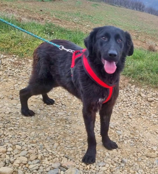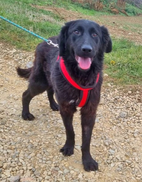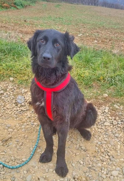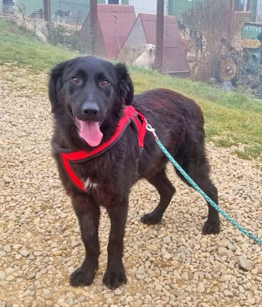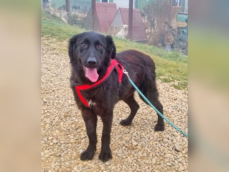 Er geht bereits gut an der Leine und versteht sich prima mit den anderen Hunden. Vom Aussehen ähnelt er etwas einem Retriever oder einem schwarzen Hovawart. Welche Rassen in ihm stecken ist aber leider unbekannt.