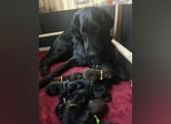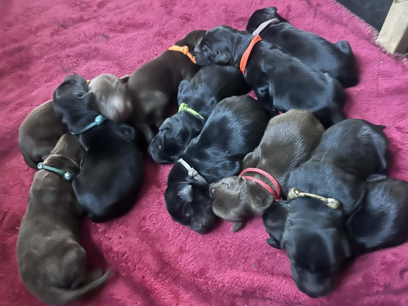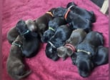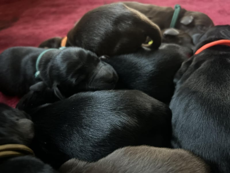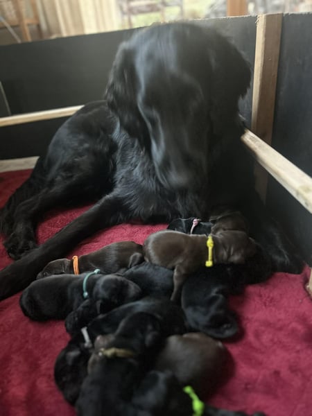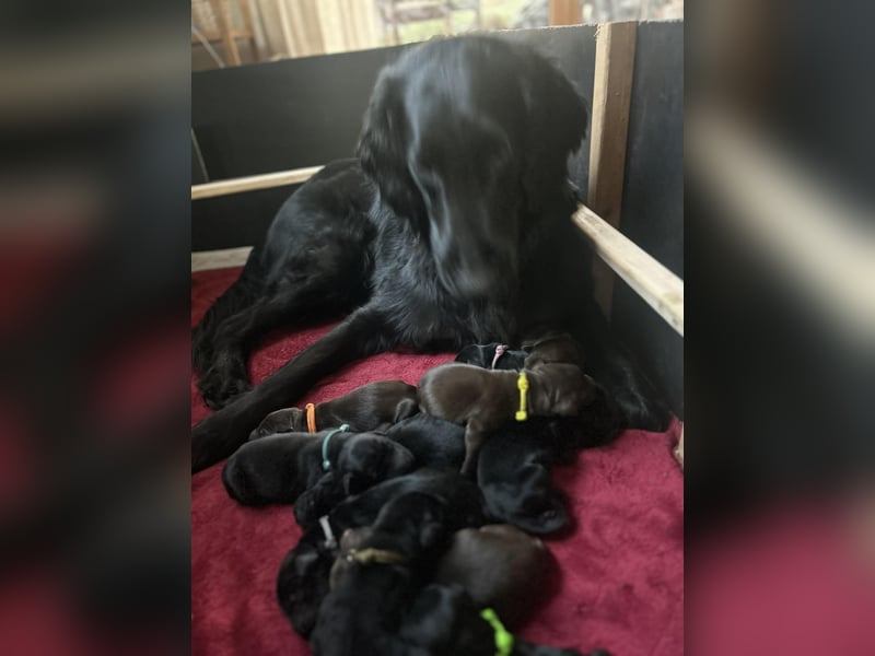 Beide Eltern sind glänzend schwarz, elegant gebaut, mit wunderschönem Kopf und dem typischen, nie erlöschenden Flatcoat-Lächeln.