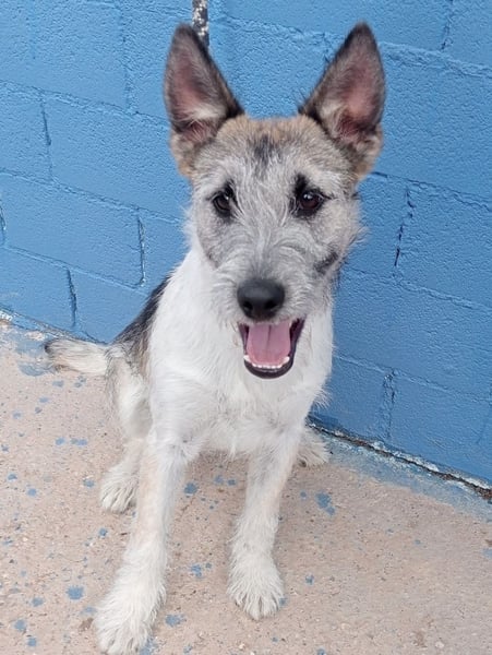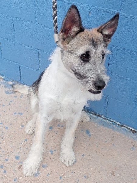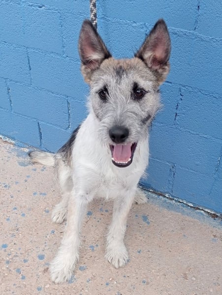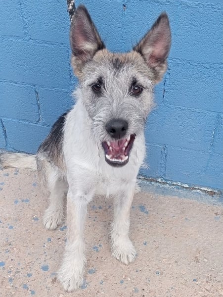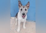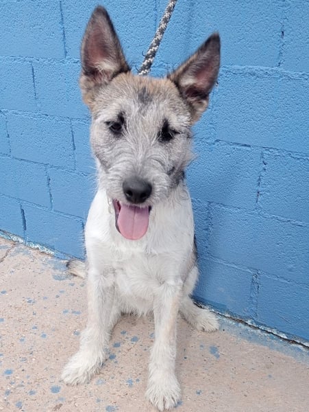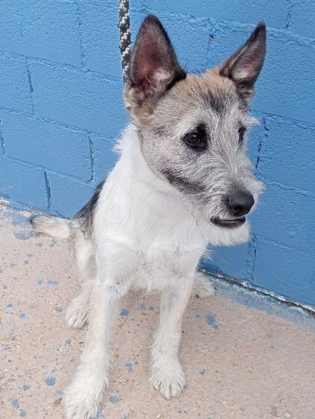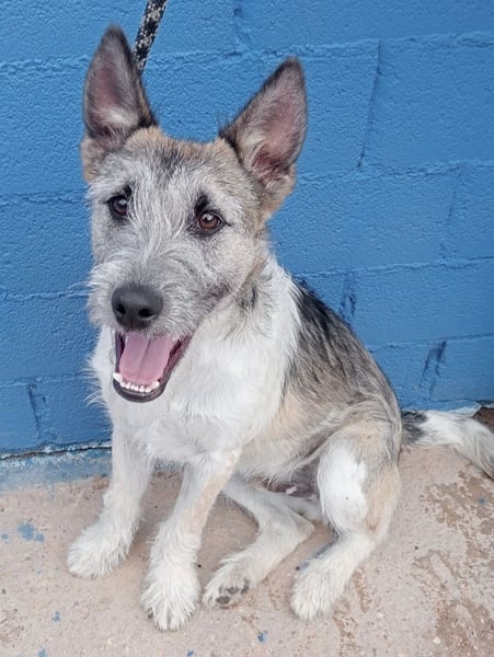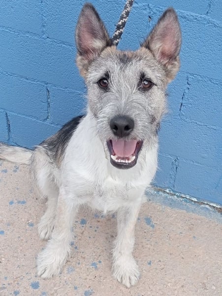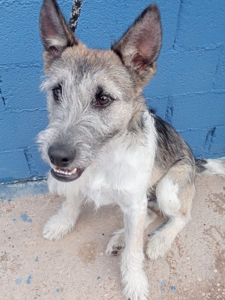Sein hübsches grau-weiß-braunes Fell und der leichte Unterbiss machen ihn zu einem echten Hingucker mit ganz eigenem Charme.