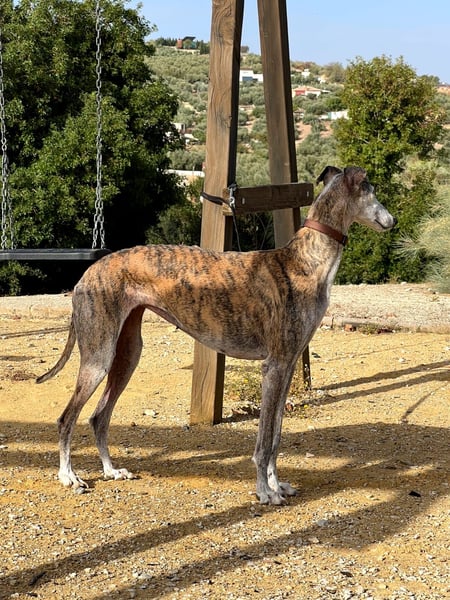 Die wunderschöne, gestromte Artillera ist eine elegante, sanfte und sensible Hündin, die im Mai 2017 geboren wurde. Mit ihren 61 cm Länge, 63 cm Schulterhöhe und einem Gewicht von 25 kg ist sie eine imposante, aber wunderbar zarte Erscheinung.