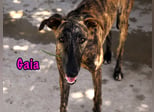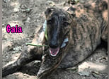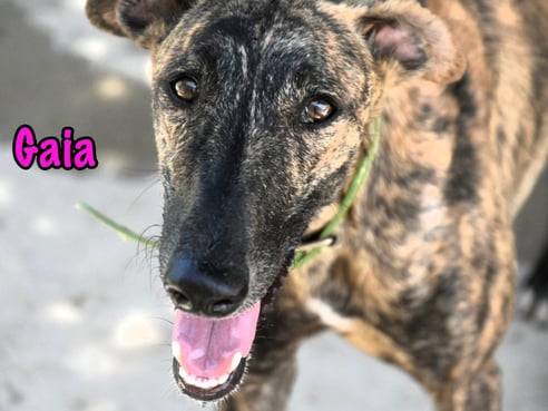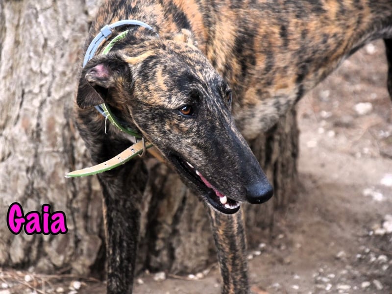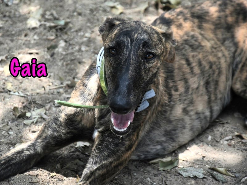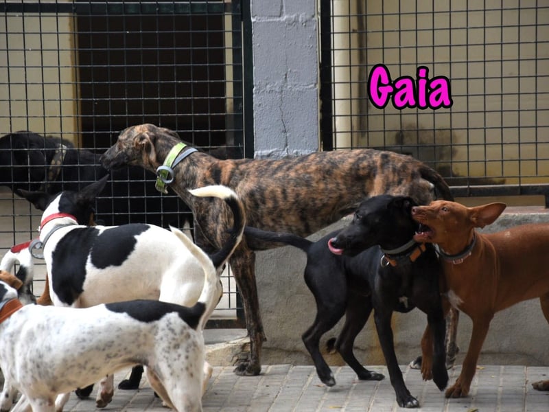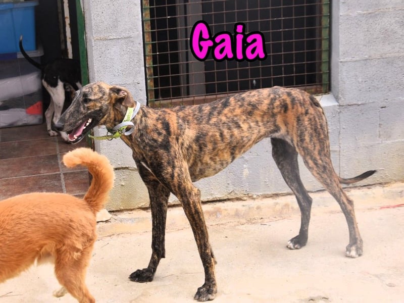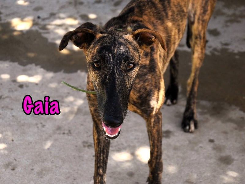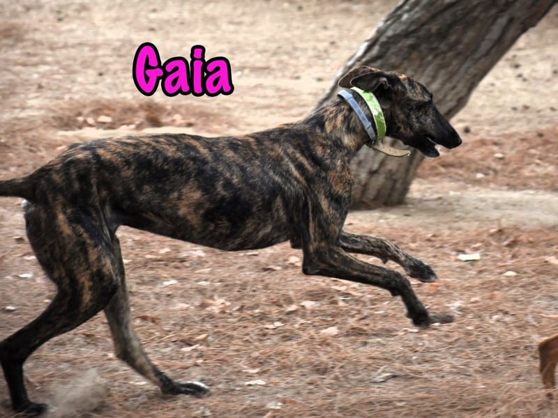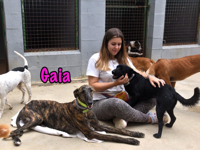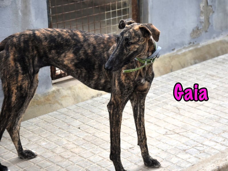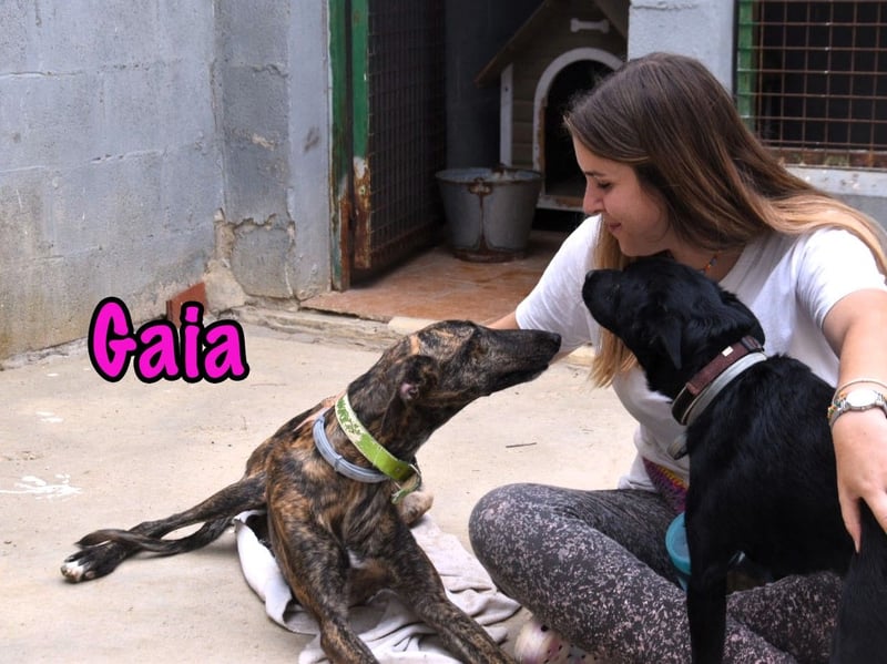 Gaia wurde in Barbate gerettet, einem Küstendorf, in dem viele Galgueros leben, die ihre Hunde oft schlecht behandeln. Sie befand sich an einem sehr schlechten Ort, den man in Spanien „Zulo“ nennt: viele Galgos zusammen in einem Loch, ohne Licht, ohne Luft, meist mit zu wenig Futter, ständig in Angst und Hunger. Glücklicherweise konnte Gaia früh, mit knapp sechs Monaten, aus dieser Situation befreit werden und musste dieses elende Leben nicht lange ertragen.