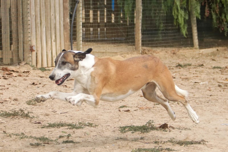 Er läuft gut an der Leine, kann Sitz machen, Pfötchen geben und ist an ein Leben im Haus gewöhnt.