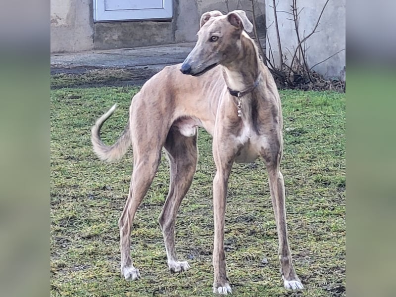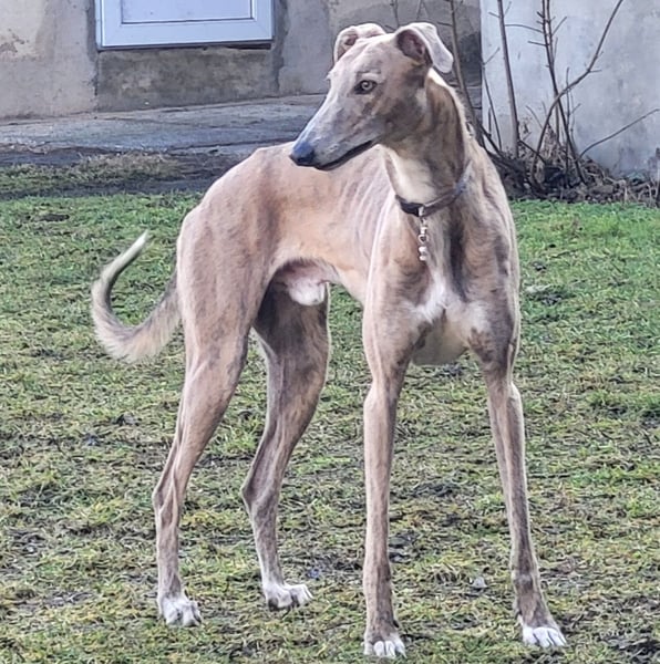 Unser 3 jähriger Galgo Espanol steht geeigneten Hündinnen als Deckrüde zur Verfügung. Durch seine muskelösen Körperbau und seine seltene Farbgebung in blue brindle gestromt, ist er eine imposante und edle Erscheinung. Ari hat eine starke Bindung zu seiner Familie und seinen Bezugspersonen. Fremden Menschen und Kindern gegenüber zeigt er sich offen und neugierig ohne aufdringlich zu sein. Sein Jagdtrieb ist mäßig ausgeprägt. Er ist auf die Hundepfeife konditioniert und im Gelände auch ohne Leine gut abrufbar. Er eignet sich gut zur Veredlung anderer Rassen wie z.b Collies, Golden Retriever aber auch für andere Windhundrassen jeglicher Art.