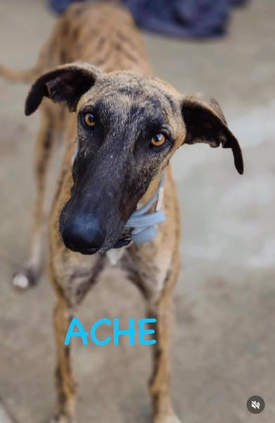 Ache feiert im März 2026 seinen ersten Geburtstag. Sein Leben bisher hätte mit Lernen, Schmusen, Spielen, Wachsen und Spaß gefüllt sein sollen, stattdessen kannte unser gestromter Galgobub nur Schläge, den Kampf ums Überleben in einem dunklen Verschlag mit anderen hungrigen und aggressiveren Hunden, und die Angst, wenn sein Halter sich ihm näherte.