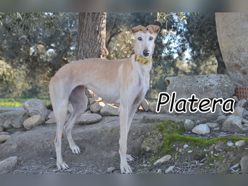 Platera ist eine wunderschöne Galga mit einer ganz besonderen Ausstrahlung. Ihr schlanker, eleganter Körper und ihre sanften Augen spiegeln die typische Anmut dieser Rasse wider – und dann sind da noch ihre lustigen Ohren, die ihr einen ganz eigenen, liebenswerten Charme verleihen. Sie wirkt gleichzeitig edel und verspielt, ruhig und doch voller leiser Lebensfreude.