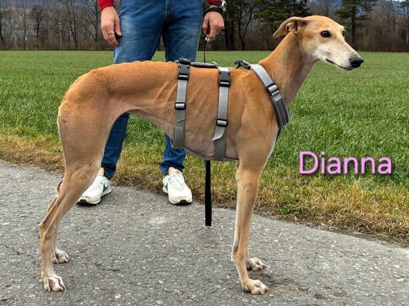 Dianna ist eine 3 Jahre alte Galgo-Hündin und lebt aktuell auf einer Pflegestelle, wo sie jeden Tag ein Stück mehr in ihrem neuen Leben ankommt. Sie ist sehr freundlich, offen gegenüber Menschen und sucht in dem Galgo-typischen Stil aktiv Kontakt. Auch Männern begegnet sie ohne Scheu. Im Alltag zeigt sich Dianna sensibel und aufmerksam. Sie ist dabei nicht ängstlich, sondern eher unsicher in einzelnen Situationen. Vermutlich hat sie früher gelernt, Herausforderungen lieber aus dem Weg zu gehen. Heute stellt sie sich ihnen. Man sieht deutlich, wie sie täglich mutiger wird. An der Leine läuft Dianna gut. In bestimmten Situationen, zum Beispiel bei vorbeifahrenden Autos, benötigt sie noch Unterstützung. Sie geht dabei nicht in die Flucht, sondern bleibt stehen und orientiert sich am Menschen. Mit ruhiger Begleitung meistert sie diese Momente. Das Autofahren bereitet Dianna keine Probleme. Gegenüber anderen Hunden verhält sie sich unterwürfig und freundlich. Ein vorhandener Zweithund ist möglich, aber keine Voraussetzung für ihr Glück. Für Dianna wünschen wir uns ein liebevolles, geduldiges Zuhause, das ihr Sicherheit gibt und Freude daran hat, ihre Entwicklung weiter zu begleiten. Sie bringt alles mit, um eine wunderbare Begleiterin zu werden. Man muss ihr nur die Chance geben.