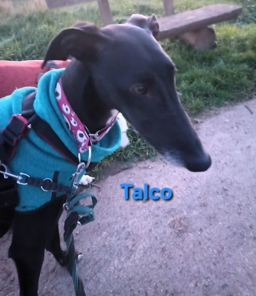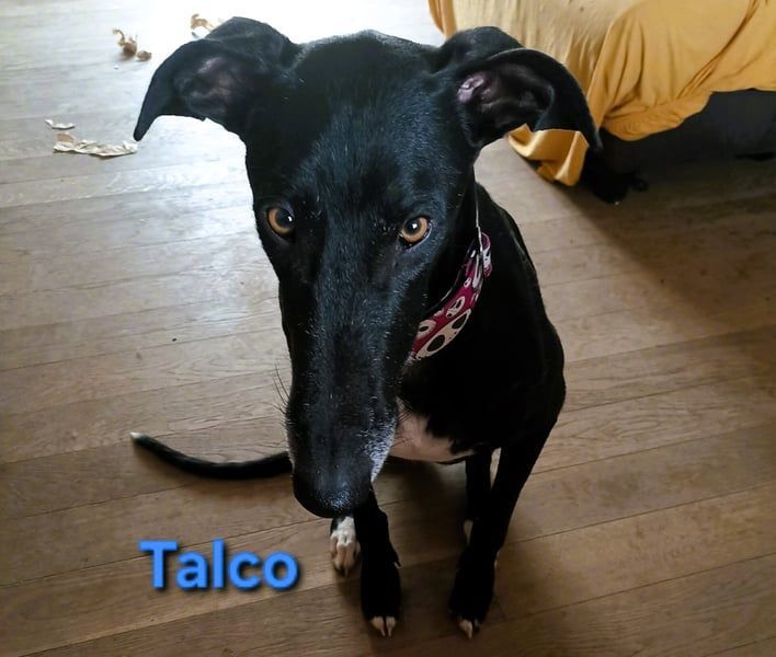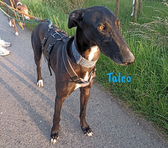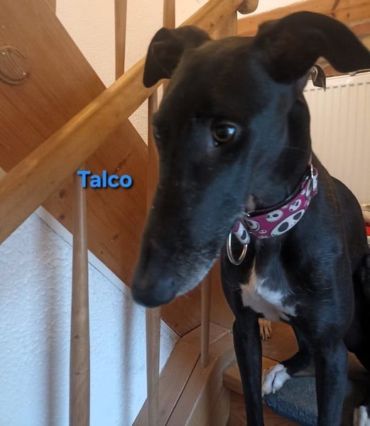 Talco ist Ende Mai 2025 in seiner Pflegefamilie angekommen. Als er die Galgos der Pflegestelle sah, hat er diese freudig begrüßt. Er hat einen zufriedenen Eindruck gemacht, da diese ihn freundlich empfingen. Anschließend wurde erst einmal der Hunger gestillt und nach einem kurzem Schläfchen ausgiebig mit der jungen Galga gespielt. Natürlich hat er auch immer wieder die Streicheleinheiten genossen, da er ein richtiger Schmusebär ist. Bei ihm sieht man es allerdings, dass er mehr die Nähe der vorhandenen Galgos sucht und diese sichtlich genießt. Daher wird er sich in einem Zuhause bei mindestens einem vorhandenen verspielten Hund, der ihm größenmäßig ebenbürtig ist, sicherlich am wohlsten fühlen. Talco ist ein großer Rüde (aktuell ca. 67 cm und 26,6 kg) , allerdings in seinem Kopf noch nicht. Altersbedingt ist er ein Quatschi, sehr verspielt, etwas grobmotorisch und ein kleiner Tollpatsch, was ihn noch weiter liebenswert macht. Der liebe Bub kann auch sehr schön mit den Hundespielzeugen alleine spielen und bringt diese auch gerne mit in die Küche - zum Tauschen gegen was Leckeres. Der Quatschi kann sowieso alles gebrauchen, deshalb klaut er auch alles und hat keine Probleme damit, seine Beute zu futtern oder zu zerlegen. Talco ist neugierig, clever, sehr aufmerksam, wachsam und schlägt an bei Bewegungen rund ums Haus. Besucher im Haus oder Garten werden misstrauisch beäugt. Da soll noch jemand sagen, Galgos bellen nicht und sind keine Wachhunde. Gerade Männer werden skeptischer beäugt oder gar anbellt. Sind sie ihm sympathisch, nimmt er Kontakt auf. Bei Menschen und Hunden außerhalb des Grundstückes entscheidet ebenfalls die Sympathie, dies konnten wir im Hundeauslauf beobachten. Was nicht schlimm ist, wir Menschen finden auch nicht jeden super. Da alle Hunde der Pflegestelle im Auslauf einen Maulkorb tragen gilt dies auch für Talco, dieser hatte keine Probleme damit. Gefallen ihm die Menschen bzw. Hunde, wird vorsichtig Kontakt aufgenommen und gespielt, die anderen werden vom weiten auch Mal kurz angebellt.