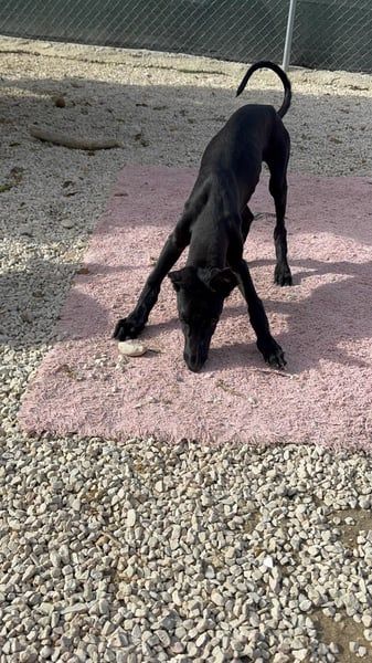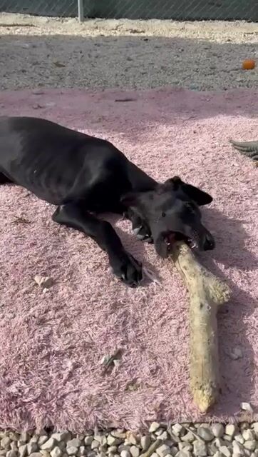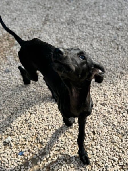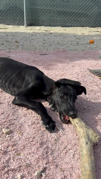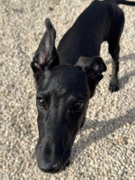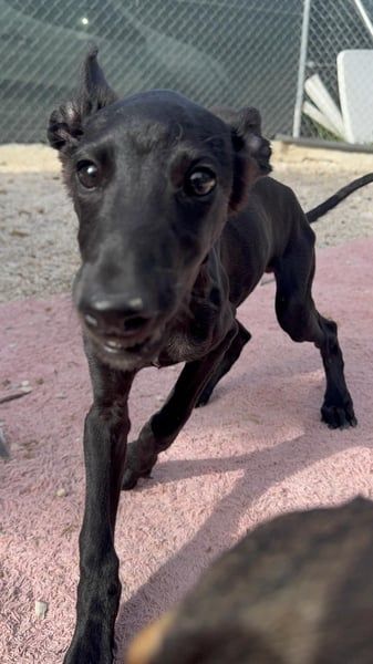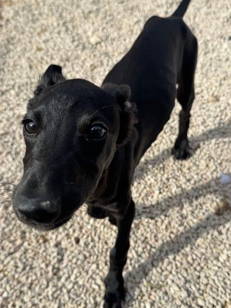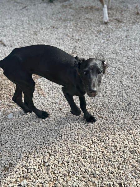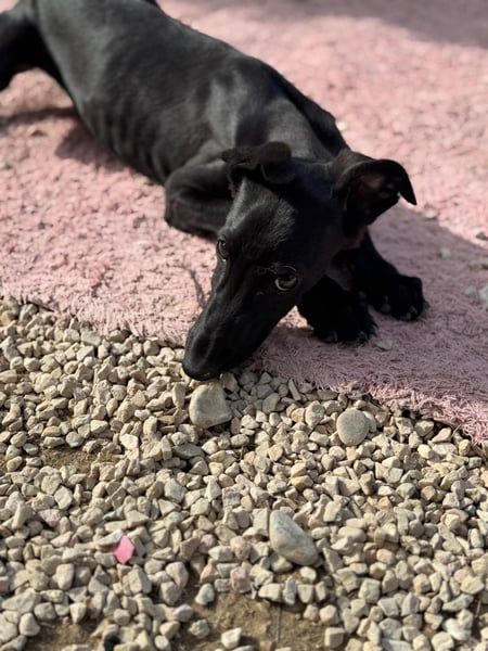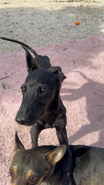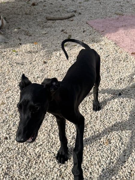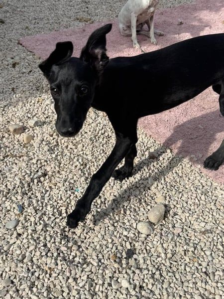 Ruinero ist ein hübscher, schwarzer Galgo-Rüde, der im Juli 2025 geboren wurde und etwa 7 kg wiegt. Er kam als Welpe ins Tierheim von Andres und zeigt sich hier als ausgesprochen gutmütiger, anhänglicher und aufgeschlossener junger Hund.