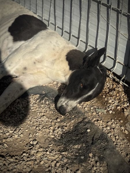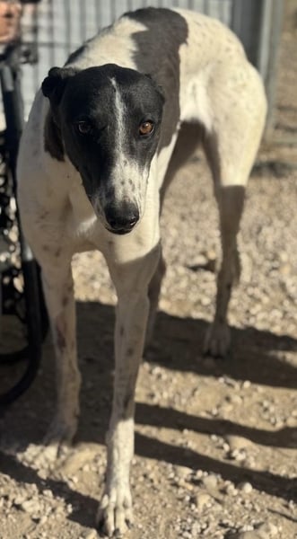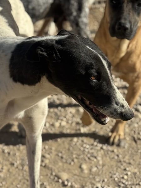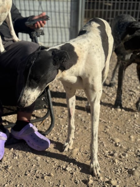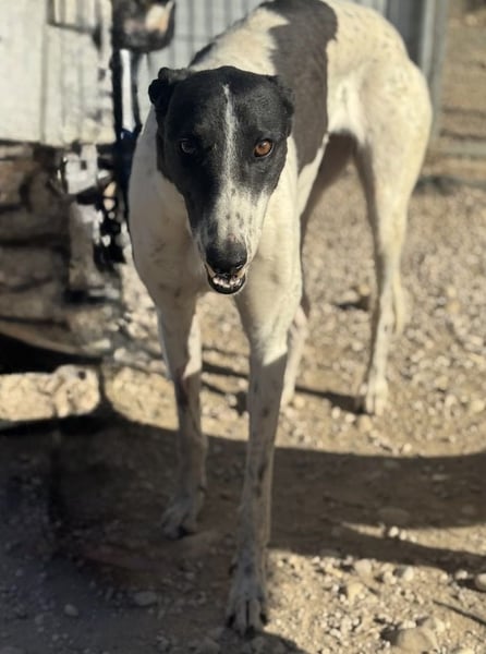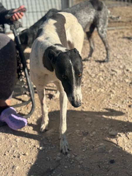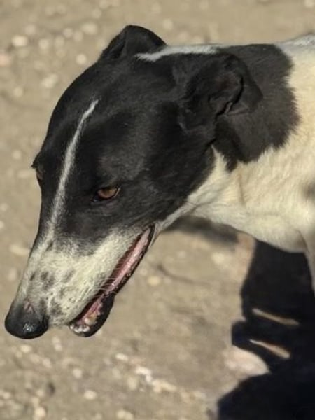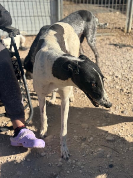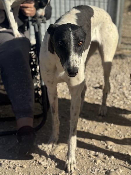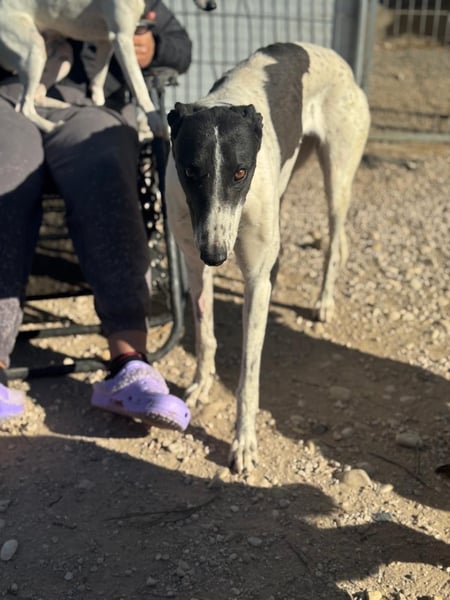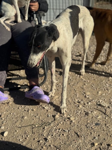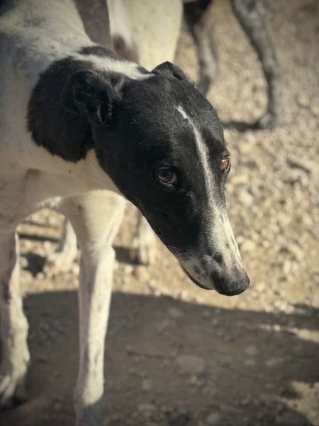 Die wunderschöne, schwarz-weiße Galga Chantelle wurde im Februar 2024 geboren und kam im November 2025 als Abgabe eines Jägers ins Tierheim. Trotz ihres schwierigen Starts zeigt sich die junge Hündin als äußerst liebevoll und anhänglich. Anfangs begegnet sie neuen Menschen noch etwas schüchtern.