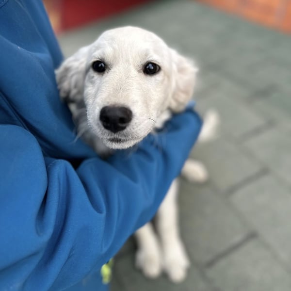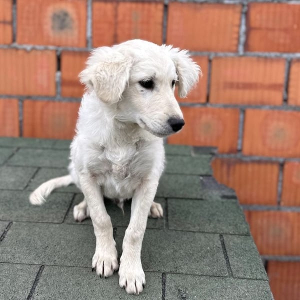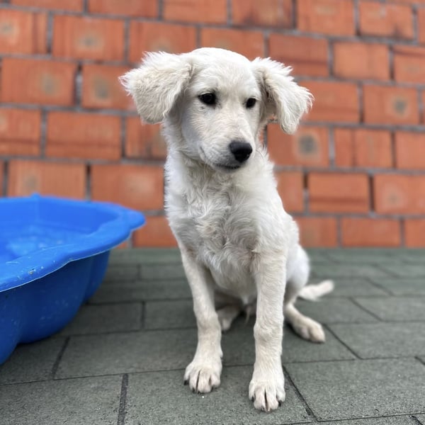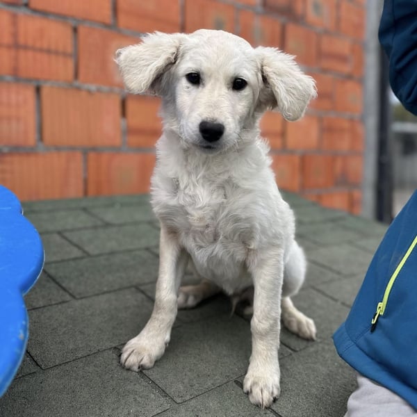 Dobby ist laut Tierarztschätzung ca. 4 Monate alt (geb. 10.06.2025), wiegt etwa 8 kg und ist ca. 38 cm groß. Vermutlich handelt es sich um einen Golden-Retriever-Mix.