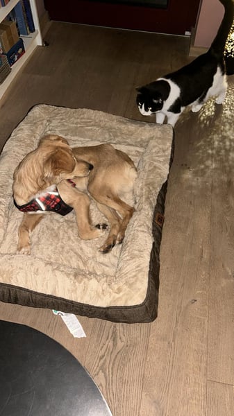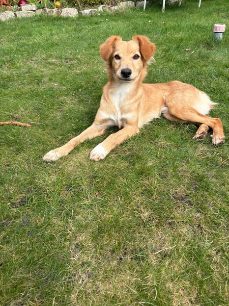 Freddy ist ein super lieber und lernfreudiger Hund. Er hört bereits auf seinen Namen, kennt Kommandos wie "Sitz" und "Körbchen" und bleibt an der Straße brav sitzen. Auch an der Leine läuft er schon richtig klasse und liebt Spaziergänge durch den Wald.