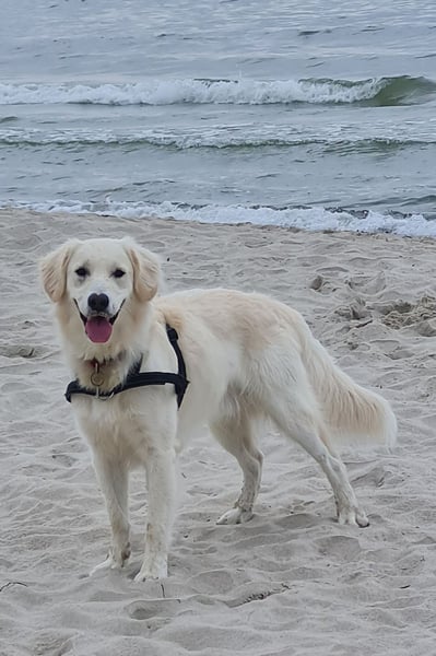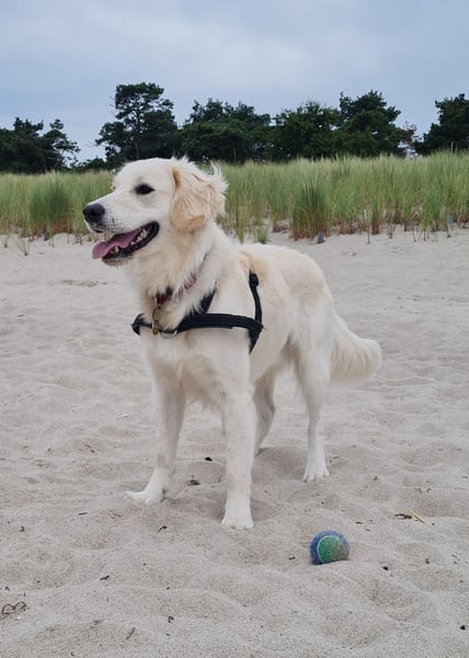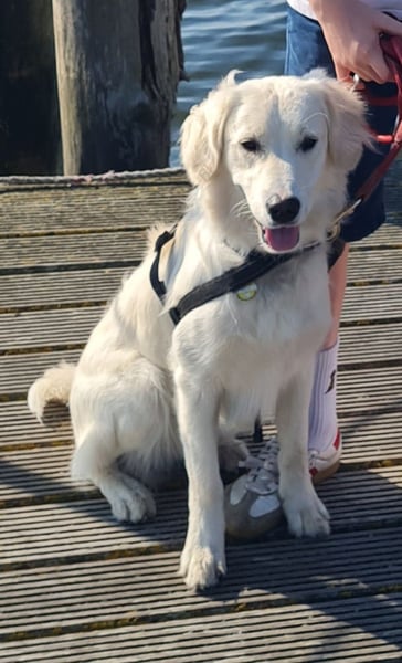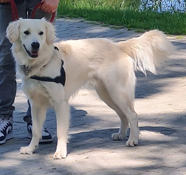 Er hat einen kleinen Anteil Border Collie, ist also nicht reinrassig, ein Elternteil ist aber zu 100% Golden Retriever.