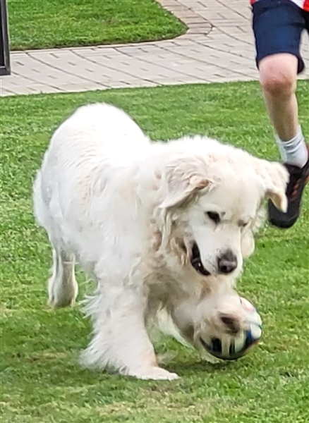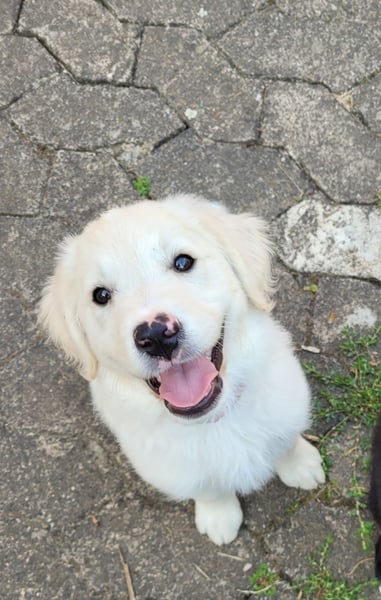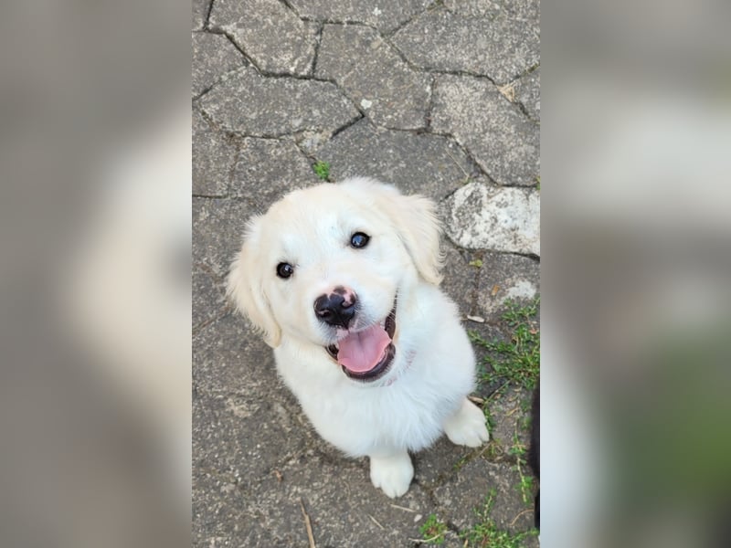 Der Vater ist ein reinrassiger Golden Retriever mit wunderschönem cremefarbenen Fell. Er ist ein sehr ruhiger und ausgeglichener Hund, der Kinder liebt und ausdauernd mit ihnen spielt. Er hat sanfte dunkle Augen. Mit unseren Kindern spielt er z.B. leidenschaftlich gern Fußball, ist dabei ein echter Team-Player für beide Mannschaften :-) . Als Kuschel-Bär durch und durch, lässt er sich für sein Leben gern kraulen. Alle mögen ihn und er erobert Herzen wie im Flug aufgrund seines lieben und unkomplizierten Wesens. Er ist super leinenführig und geht freundlich auf andere Hunde zu. Aggression ist ihm fremd, er ist einfach ein freundlicher, lieber Kerl, den man knuddeln und lieb haben möchte. Das Autofahren und Reisen, sowie Aufenthalte in Restaurants, Hotels sind für ihn auch kein Problem. Er ist Fremden gegenüber stets aufgeschlossen und freundlich.