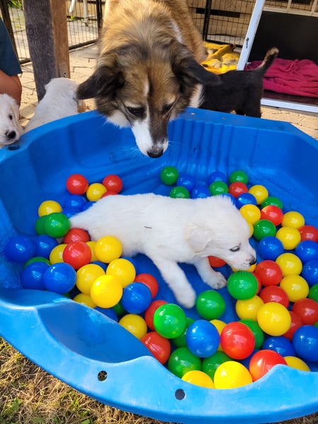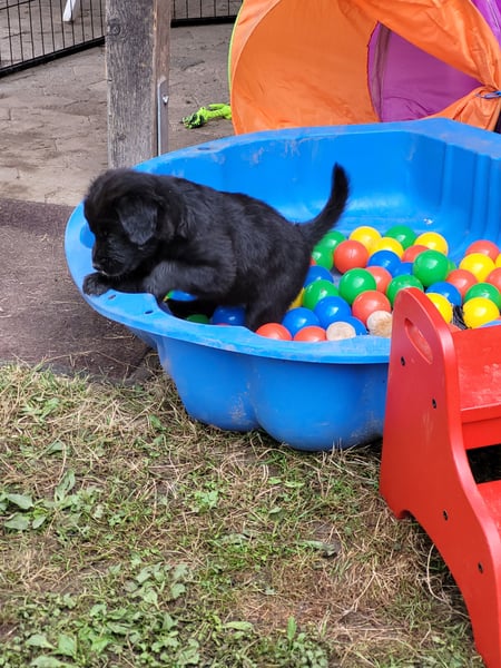 Bei der Aufzucht ist es uns sehr wichtig, die Welpen an möglichst viele Alltagsgeräusche zu gewöhnen, und ihnen den Kontakt zu erwachsenen Hunden zu ermöglichen. Die Welpen werden bereits erste kurze Autofahrten kennenlernen und ebenso auch behutsam an Leine und Halsband gewöhnt werden. Viel Spielen, Kuscheln und viel Abwechslung neben ausreichend Ruhestunden werden ihnen helfen einen optimalen Start in ihr Leben zu haben. Die erste Zeit werden die Welpen nur bei uns im Wohnbereich unseren Hauses, später auch auf Erkundung in unserem Garten sein. Der Garten ist eingezäunt, so dass sie sich auch frei bewegen können. In ihrem Auslauf bereiten wir Spielzeuge und Spielgeräte vor, die ihnen helfen ihren Gleichgewichtssinn zu trainieren (z.B. Wippe, Welpen-Schaukel), sie lernen verschiedene Untergründe und die Welpen-Toilette kennen, dies wird ihnen bei dem Trainieren der Stubenreinheit zu Gute kommen und Ihnen als neue Familie nehmen wir damit bereits den ersten Schritt dahin ab. In den letzten Tagen der 8. Woche nehmen wir die Welpen auch zu zweit mit der Mama auf kurze Ausflüge außerhalb des Gartens mit, damit die Welpen lernen, dass "das Neue" „ok“ ist und dass sie sich davor nicht zu fürchten brauchen, damit wird auch hier die Basis gegeben für selbstbewusste und neugierige Hunde.