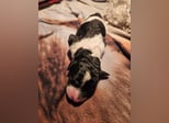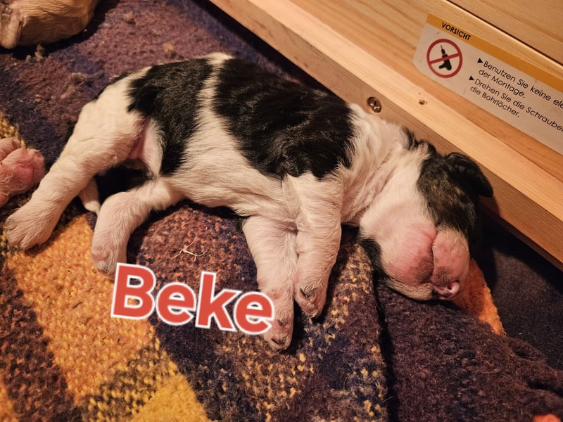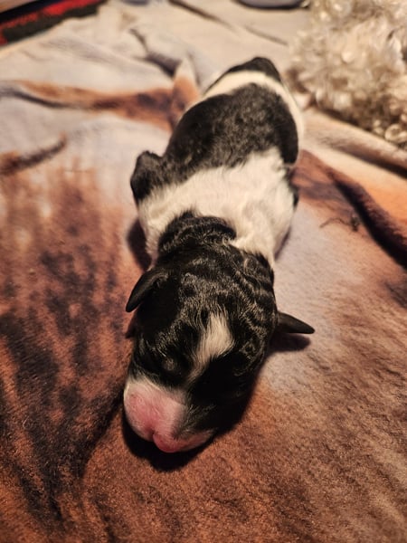 Unsere kleine Doodlenasen Beke in harlekin schwarz weiß wird bis zur Abgabe 1x geimpft, 3x entwurmt und gechipt.