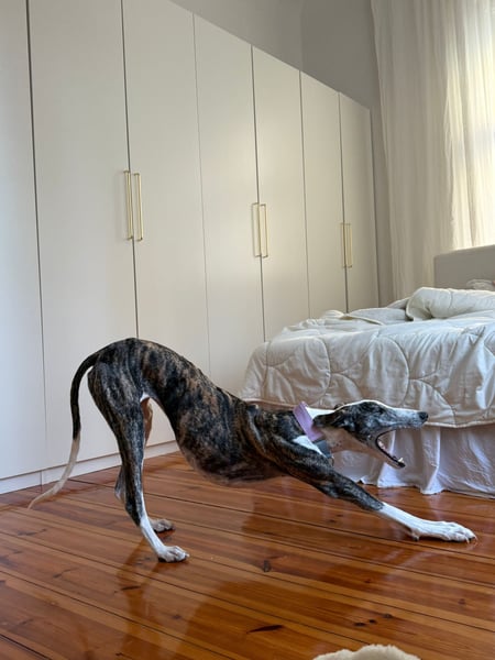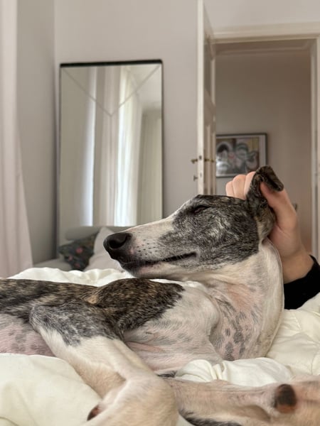 Trotz dieser Vorgeschichte ist Hypathia bemerkenswert entspannt und stabil hier angekommen. Neue Situationen begegnet sie ruhig und aufmerksam: Anfangs bleibt sie gern einmal stehen, beobachtet ihre Umgebung konzentriert und nimmt alles in Ruhe auf – ganz galgotypisch als Sichtjägerin. Nach kurzer Zeit taut sie jedoch vollständig auf und zeigt ihr wahres Wesen: extrem menschenbezogen, verschmust und anhänglich.