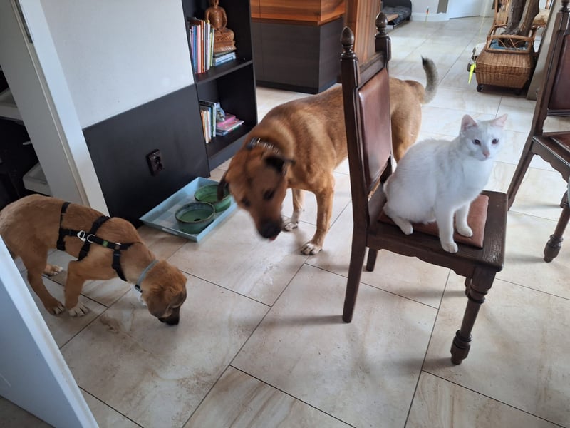 Bereits vorhandene Tiere sind für Josef kein Problem, Katzen sollten hundeerfahren sein, da Josef Welpen typisch auch gerne mal eine Spielrunde einlegen würde, was manche Katzen dann stressen könnte. Ein bereits vorhandener Hund, sollte einem so selbstbewussten Welpen wie Josef auch mental überlegen sein und keine Ängste haben.