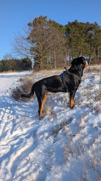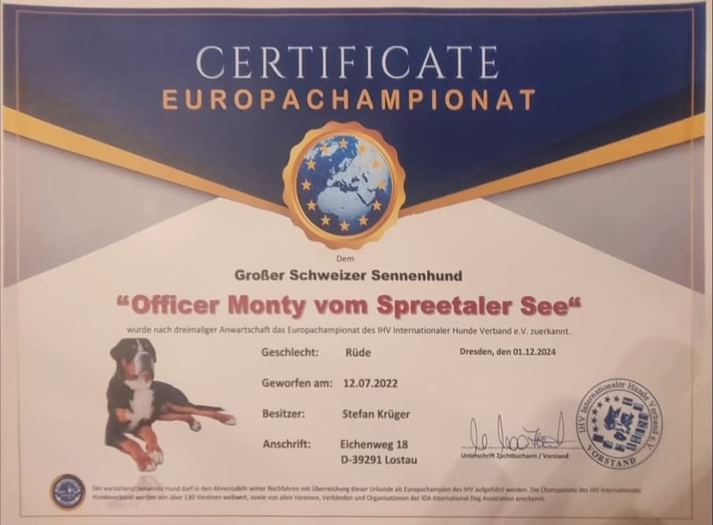 "Monty" ist ein sehr anhänglicher, liebevoller Rüde und hat eine stattliche Statur. "Monty" erhielt die Zuchtzulassung, für Hündinnen, mit Zuchtempfehlung ( für Hündinnen HUU trägerfrei und P2Y12 trägerfrei)