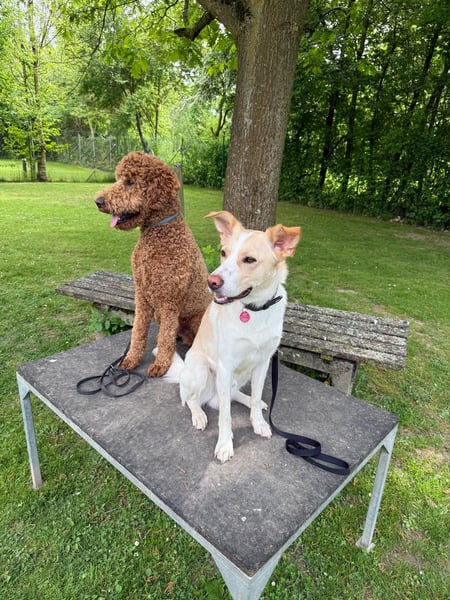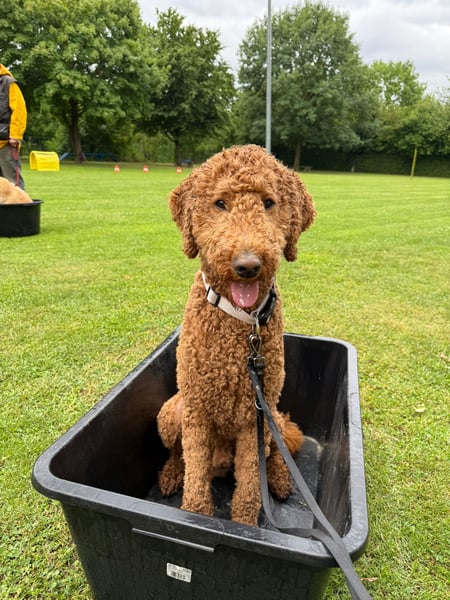 Es handelt sich hier um einen jungen Großpudel, der charakterlich durch die Bank als positiv zu bezeichnen ist. Er ist sehr sozial, pudeltypisch, kann gut mit anderen Hunden jeden Geschlechts und Menschen jeden Alters. Zurzeit befindet er sich in der Ausbildung zum Schulbegleithund. Er ist sehr gelehrig, menschengebunden und äußerst intelligent. Kontakt zu anderen Tieren (Katzen, Pferden, Eseln, etc.) besteht regelmäßig und stellt kein Problem dar.