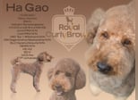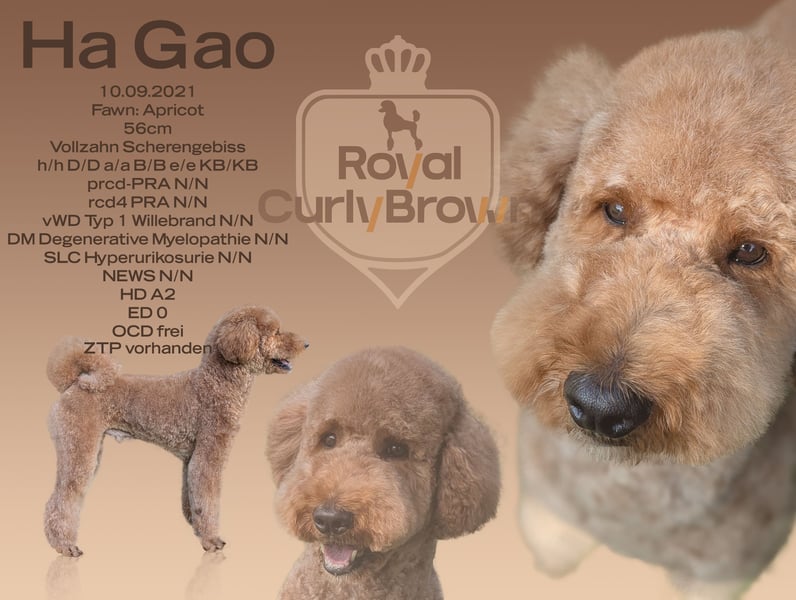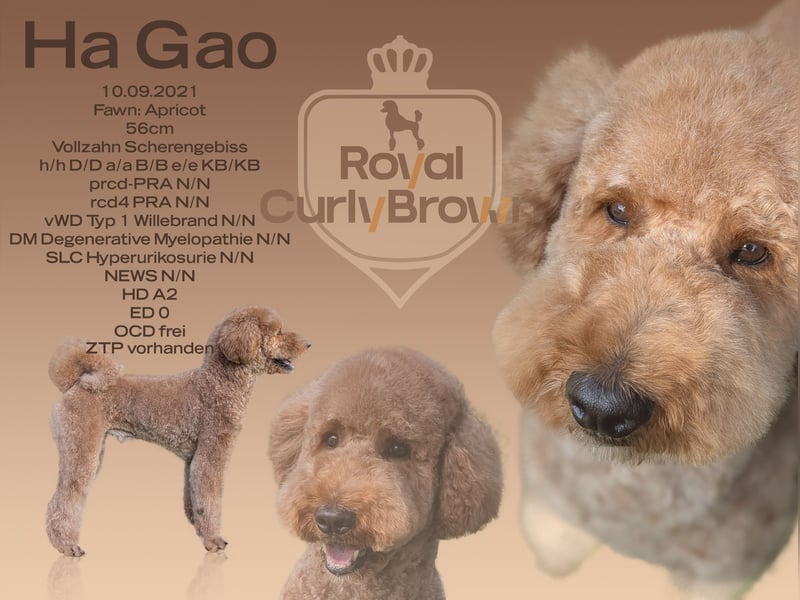 das ist unser König, Ha Gao. Er ist ein Königspudel in apricot aus einer VDH Zucht mit Papieren und ZTP. Der Deckrüde ist sehr freundlich und liebevoll und ab und zu spinnt er mal etwas rum.