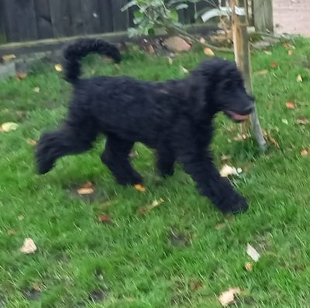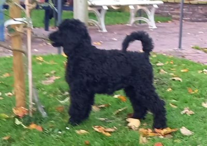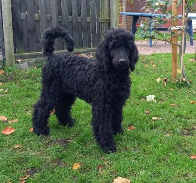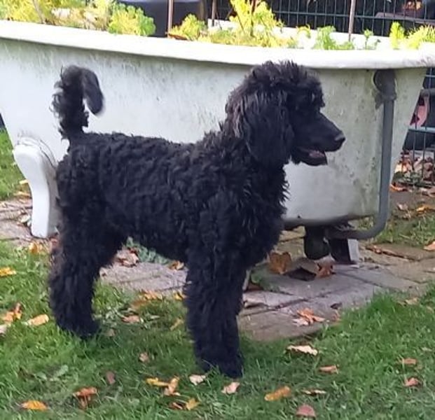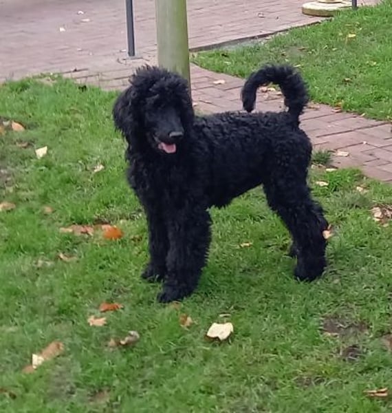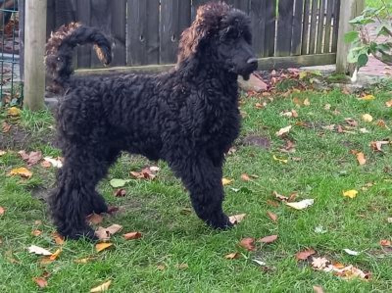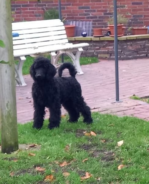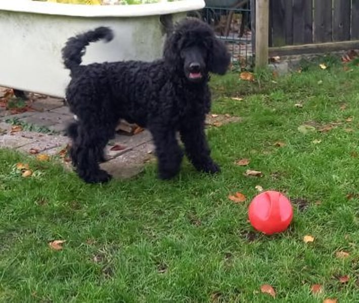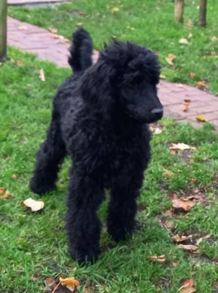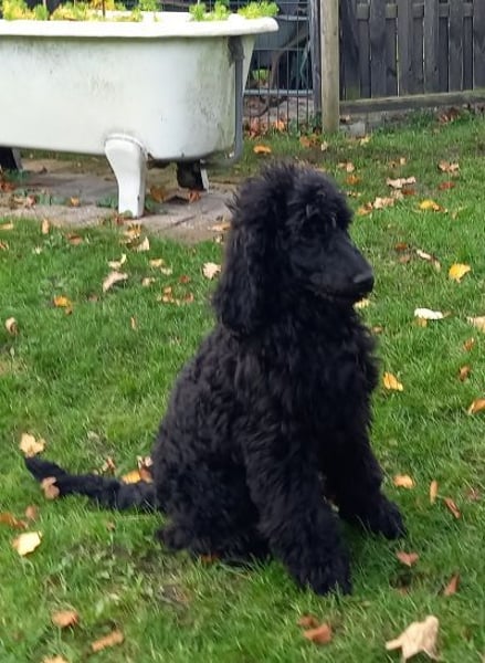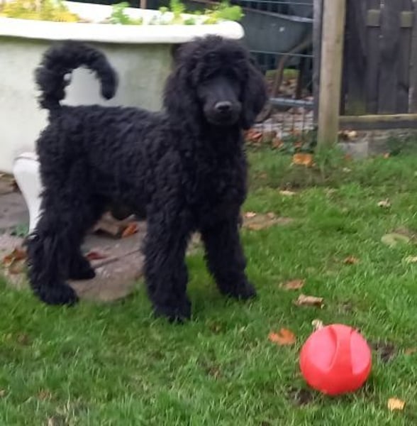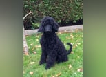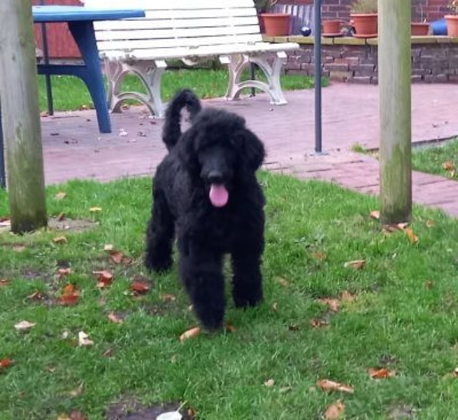 Großpudel Rüde Welpe schwarz, navi grünes Halsband Rassehunde