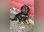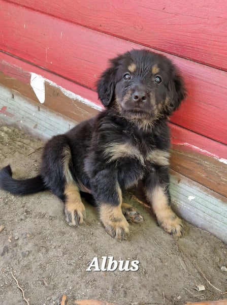 Ein schwarzmarkener dunkler Rüde mit ausgeprägter Markenzeichnung. Seine Größe entspricht voll in den Altersdurchschnitt. Albus ist ein kleiner Forscher. Alles muss untersucht werden. Angst vor neuen Gegenständen in seinem Umfeld kennt er nicht.