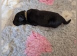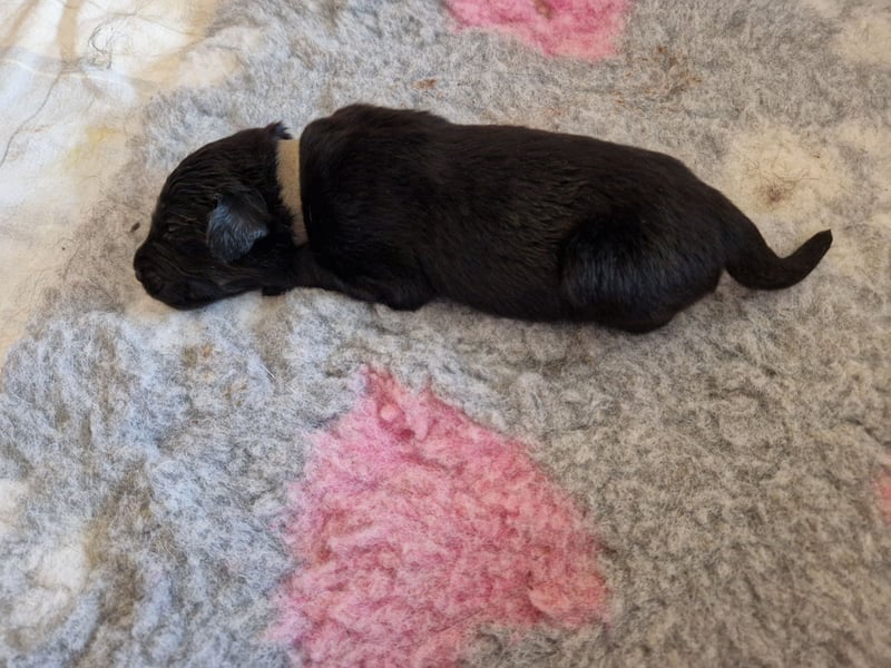 Ein schwarzmarkener Rüde mit derzeit noch schwacher Markenzeichnung. Nabel und Rute sind ohne Befund. Sein Temperament möchte der Kleine noch entwickeln.