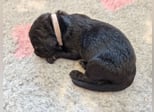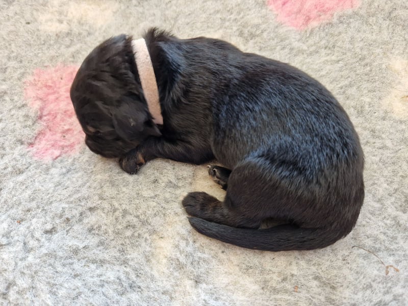 Eine schwarzmarkene Hündin mit derzeit noch schwacher Markenzeichnung. Nabel und Rute sind ohne Befund. Ihr Temperament möchte die Kleine noch entwickeln.