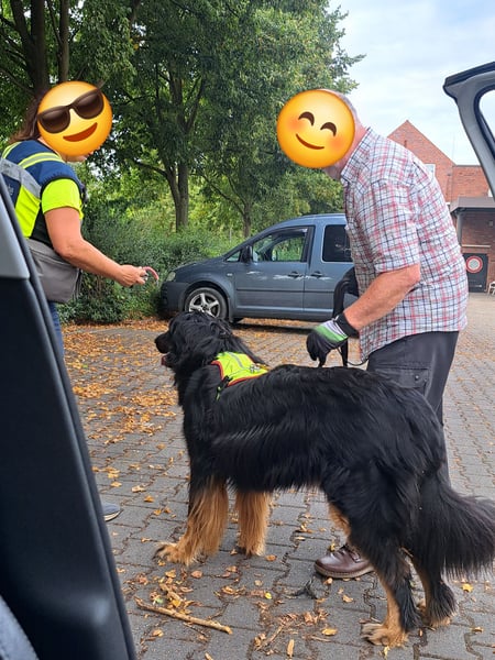 Wenn er Unsicherheit spürt hinterfragt er aber auch schon mal den Sinn des Kommandos bei klarer Ansage macht er dann aber gut mit. Maulkorb tragen ist kein Problem. Kommen Fremde ins Haus muss er auf seinen Platz, das klappt gut. Meist entspannt er sich ihnen gegenüber sehr schnell. Allerdings mag er sich nicht unbedingt von jedem gleich Anfassen lassen. Fahrradfahrer, Jogger sind kein Problem und er hat keinen Jagdtrieb. Auf andere Hunde reagiert er nur sehr selten ,von sich aus geht er Stress lieber aus dem Weg.