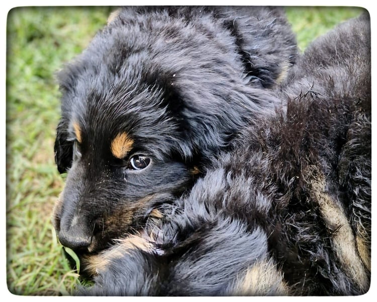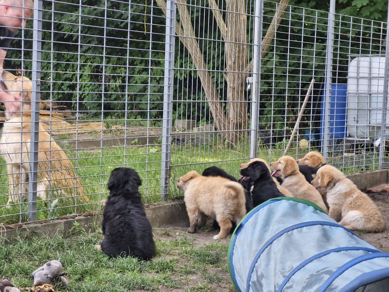 Sie wachsen mit einem Kind auf und zwei noch im Rudel lebenden älteren Hovawartmädels und einer Katze.
