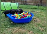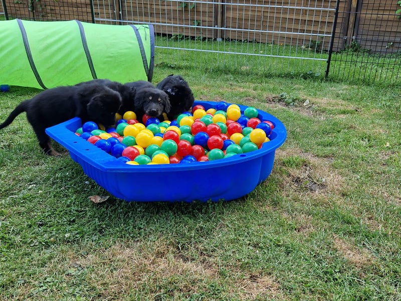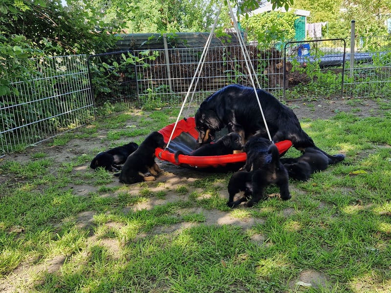 Die Welpen werden voll in unseren Alltag integriert. Sie wachsen mitten in unserem Wohnbereich auf und lernen so eine Vielzahl an Alltagsgeräuschen kennen. Im Alter von etwa 4 Wochen ziehen die Kleinen in unser frisch renoviertes Gartenhaus. Von hier haben sie jederzeit Zugang zu Ihrem geräumigen Abenteuerspielplatz im Garten.