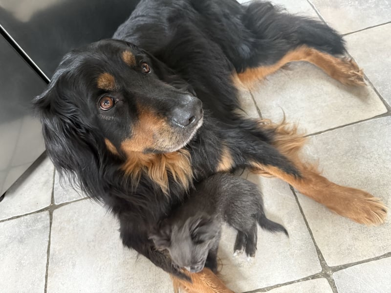 Jakob ist ein schwarzmarkener kastrierter Rüde mit Papieren, gesund, groß, HD Befund B1. Er lebt in einem Rudel mit Großspitz und Chihuahuadame. Er ist gut zu führen, hat Hundeschulen und auch Einzelstunden absolviert. Er ist abrufbar, sehr gelehrig und hat Freude daran, auch intellektuell gefordert zu werden. Seine Impulskontrolle wird regelmäßig geübt. Jakob ist sehr anhänglich und auch verschmust. Die Chihuahuadame schläft teilweise auf ihm und er überlässt ihr auch sein „Bett“, ohne es für sich zurückzufordern. Anderen Hunden gegenüber ist er eher zurückhaltend, nicht dominant. Die Trennung von ihm fällt mir extrem schwer, nach einer erneuten Verschlechterung meines Gesundheitszustandes kann ich ihm aus gesundheitlichen Gründen nicht mehr gerecht werden.